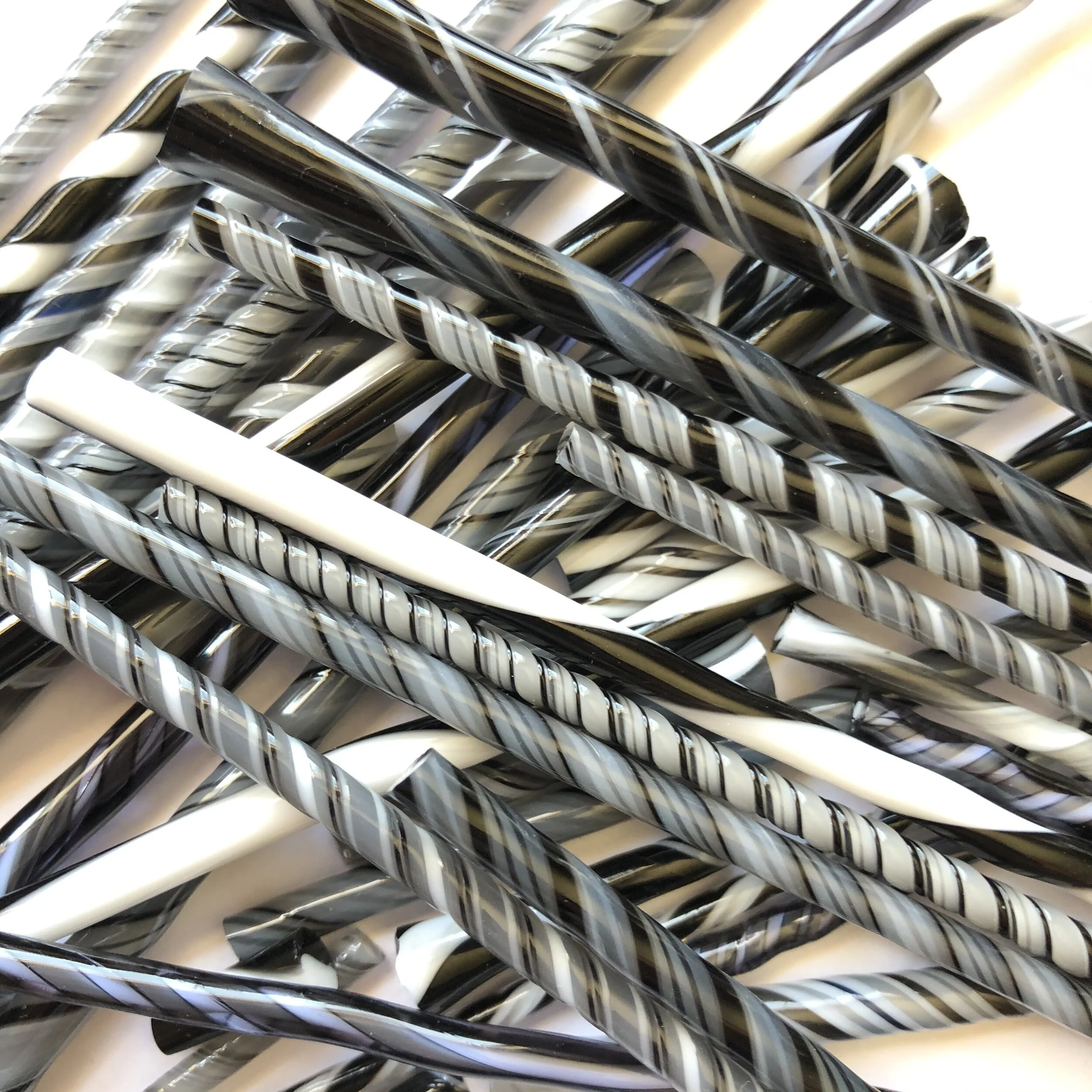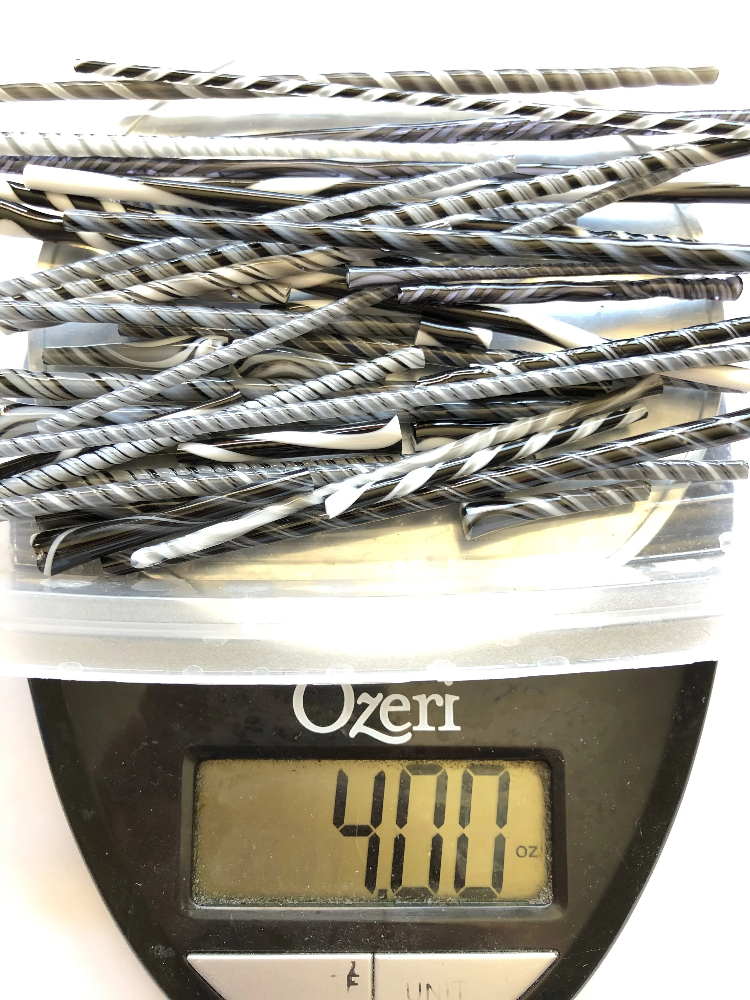 4 ounces (113 grams) of scrap twisty cane shorts and ends made from a variety of black, white, gray and clear Bullseye glass. The second picture show an example of what you will receive. It is a lot to work with!